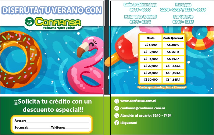 Somos una Micro Financiera del sector no Bancario, especializados en créditos personales por Deducción de Nómina y Microcrédito, con más de 20 años en el mercado, establecidos en Managua, y con presencia en los departamentos de León, Chinandega, Matagalpa, Estelí, Jinotepe, Rivas, Granada y Masaya.